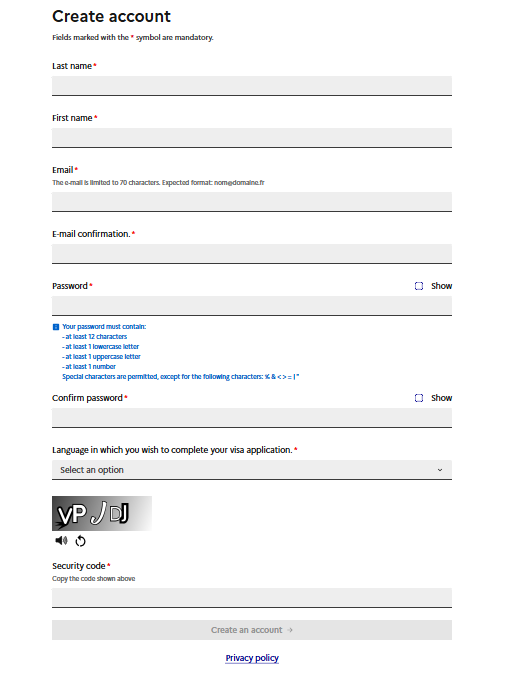 Visana sẽ hướng dẫn bạn khai đơn xin visa Pháp bằng tiếng Anh vì vậy khi truy cập vào trang web bạn hãy nhìn lên góc phải trên cùng của màn hình và lựa chọn ngôn ngữ English -> Chọn My account (Tài khoản của tôi) để tạo tài khoản -> Nhập đầy đủ các thông tin dưới đây.